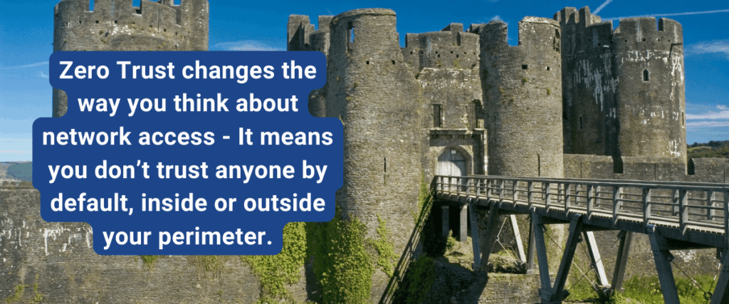 Zero Trust changes how you protect the castle. It says: don’t trust anyone by default—inside or out.