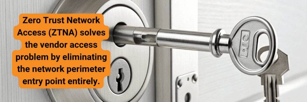 Zero Trust Network Access (ZTNA) solves the vendor access problem by eliminating the network perimeter entry point entirely. Instead of letting vendors inside your network, ZTNA creates direct, secure connections to only the specific applications each vendor needs.